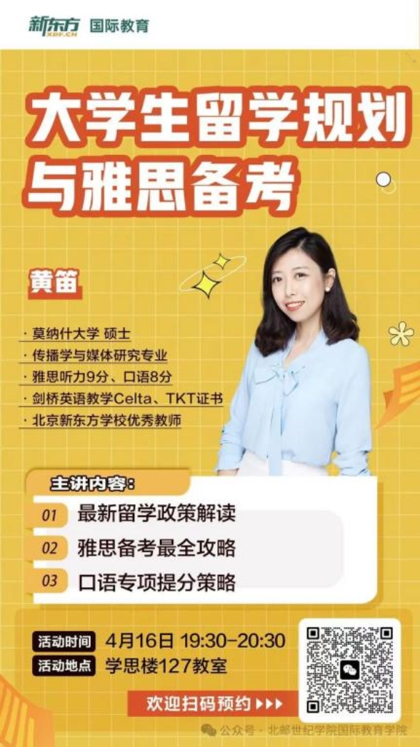 由国际教育学院特邀新东方名师黄笛老师,为同学们带来最实用的留学与雅思干货!无论你是计划出国深造,还是正在为雅思奋战,这场讲座都将为你点亮明灯!