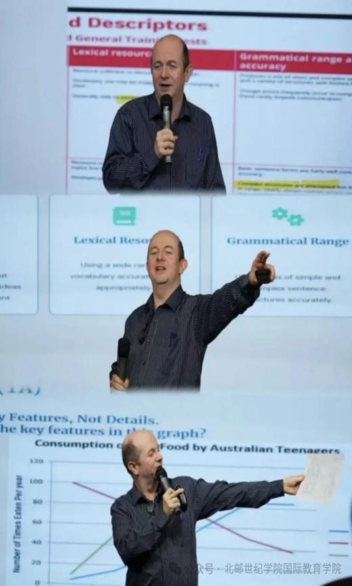本次讲座采用全英文教学。然而,讲座一开始,Kerill Kennedy 以一口流利的中文轻松开场,瞬间拉近了与同学们的距离,成功打破了语言的隔阂。他一针见血地指出,很多同学会背复杂句型,但雅思考的是“让考官听懂你的逻辑”。这一观点犹如一颗石子投入平静的湖面,在同学们心中激起层层涟漪。在雅思口语与写作的考场上,华丽辞藻的堆砌并非制胜法宝,清晰、连贯、合理的逻辑表达才是关键所在。Kerill Kennedy结合自身丰富的考官经验,深入浅出地拆解了口语“自然交流感”的关键要素——用细节串联出完整表意的句子。他形象地比喻道,一个完整的句子就像一幅生动的画卷,细节则是画卷中的色彩与线条,只有细节丰富,画卷才能栩栩如生,句子也才能让考官清晰理解考生的意图。
